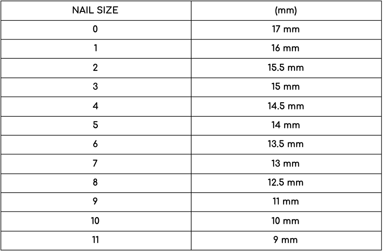 - Once you have your measurements in mm, use the following chart below to select the corresponding nail size.
